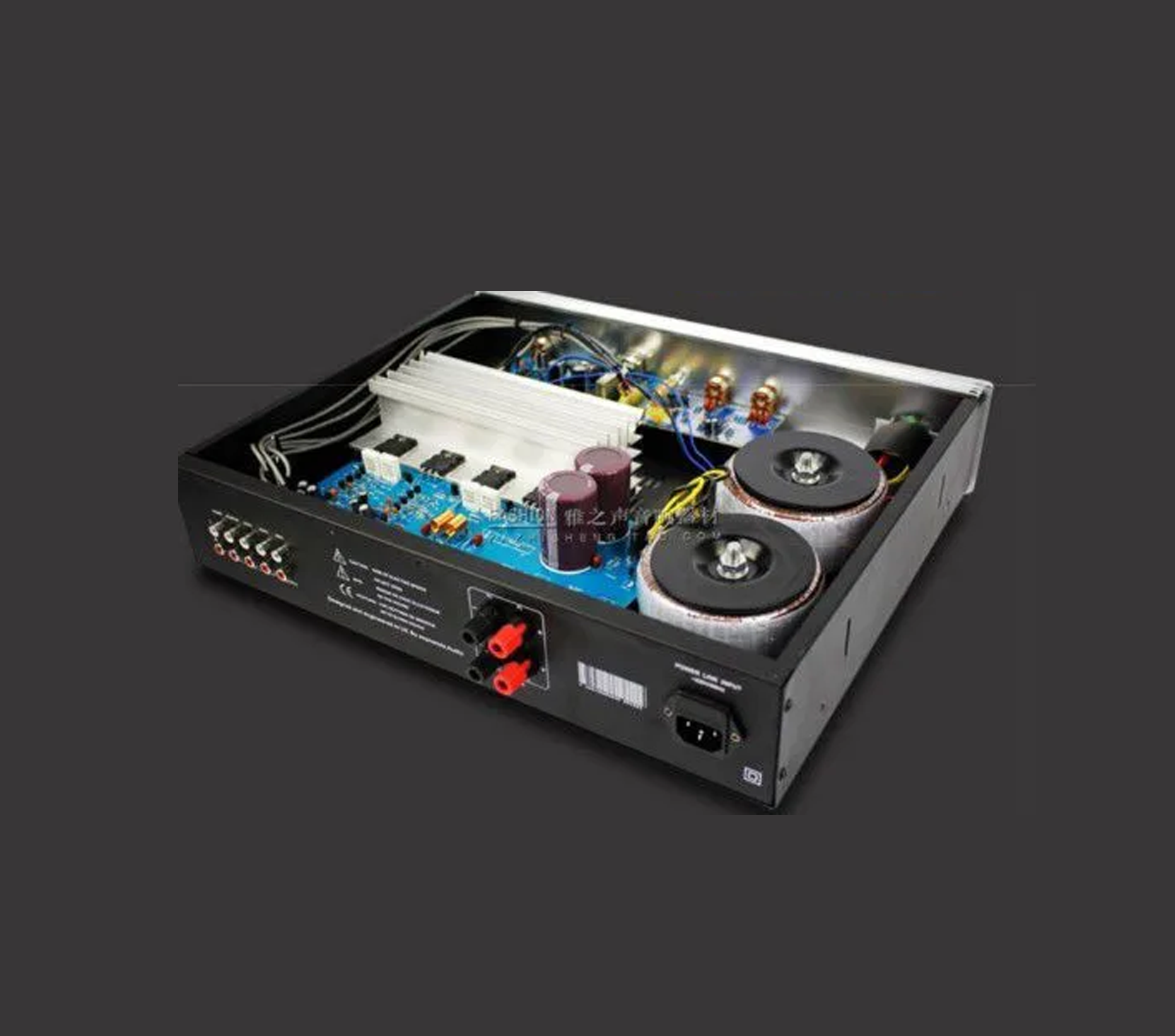 Мощность 160 ватт на 8ом.Два тороидальных трансформатора.